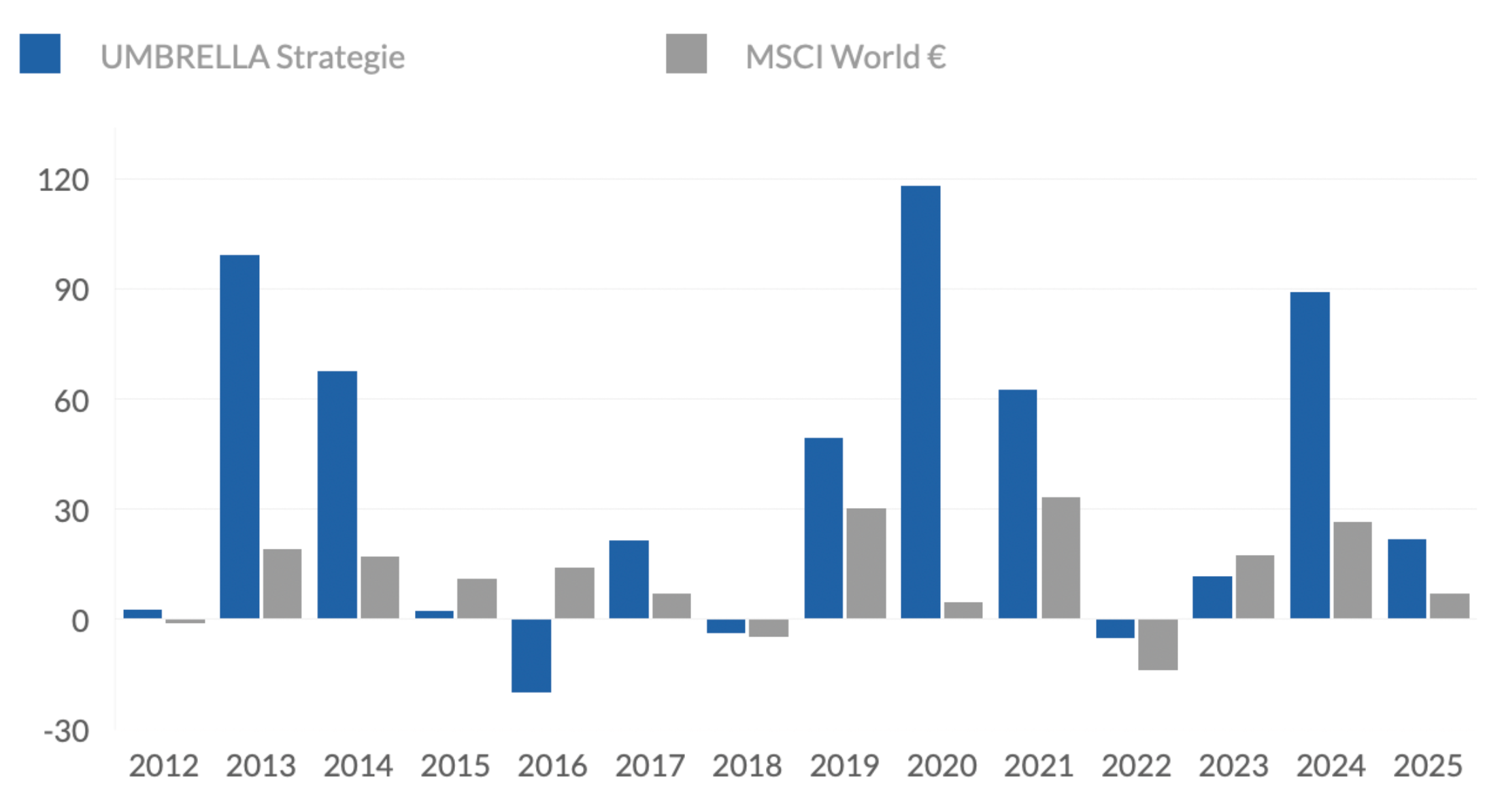 Aus einer Idee wurde eine Strategie, aus der Strategie ein Track Record – und heute vertrauen ihr über 170 Mio. Euro an Kapital. In mehr als 12 Jahren Live-Performance hat die Umbrella-Strategie eine Gesamtperformance von über 3.500 % erzielt. Damit zählt sie zu den erfolgreichsten und zugleich transparentesten Anlagestrategien im deutschsprachigen Raum – ein Beweis dafür, dass Disziplin und Innovation am Markt Bestand haben.